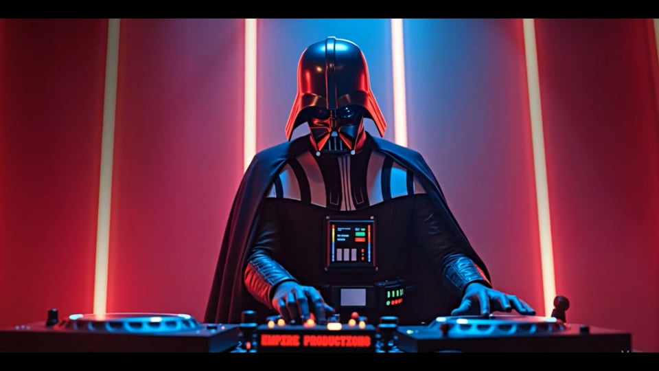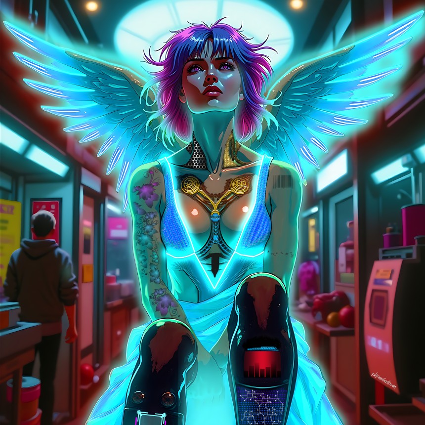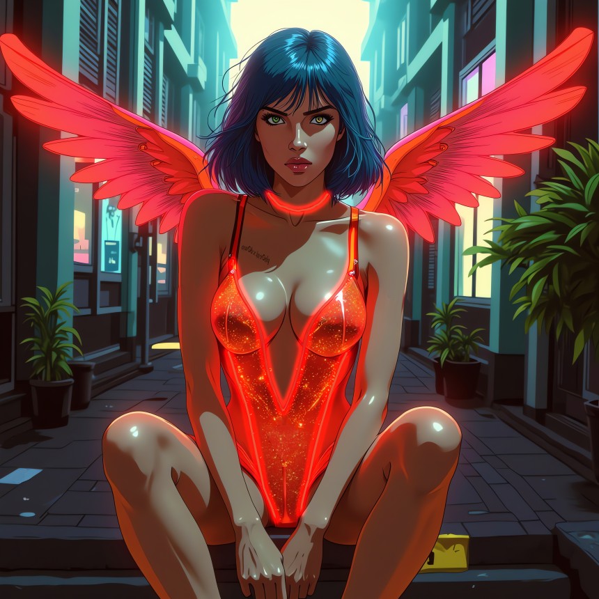 A retro neon synthwave mermaid looking into the setting sun behind a futuristic cityscape.
